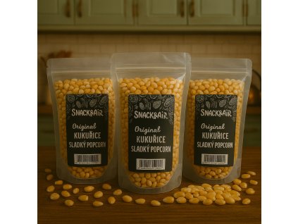 🥣 Složení: kukuřice* (85 %), kokosový olej* (13,2 %), mořská sůl (1,8 %). *Organického původu.