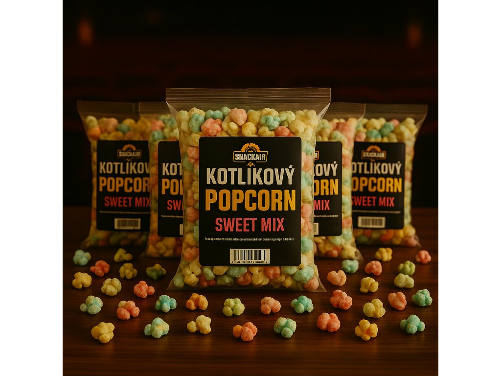 5 × 1 l barevný sladký popcorn (cca 70 g v balení) = párty, co nikdy neskončí.