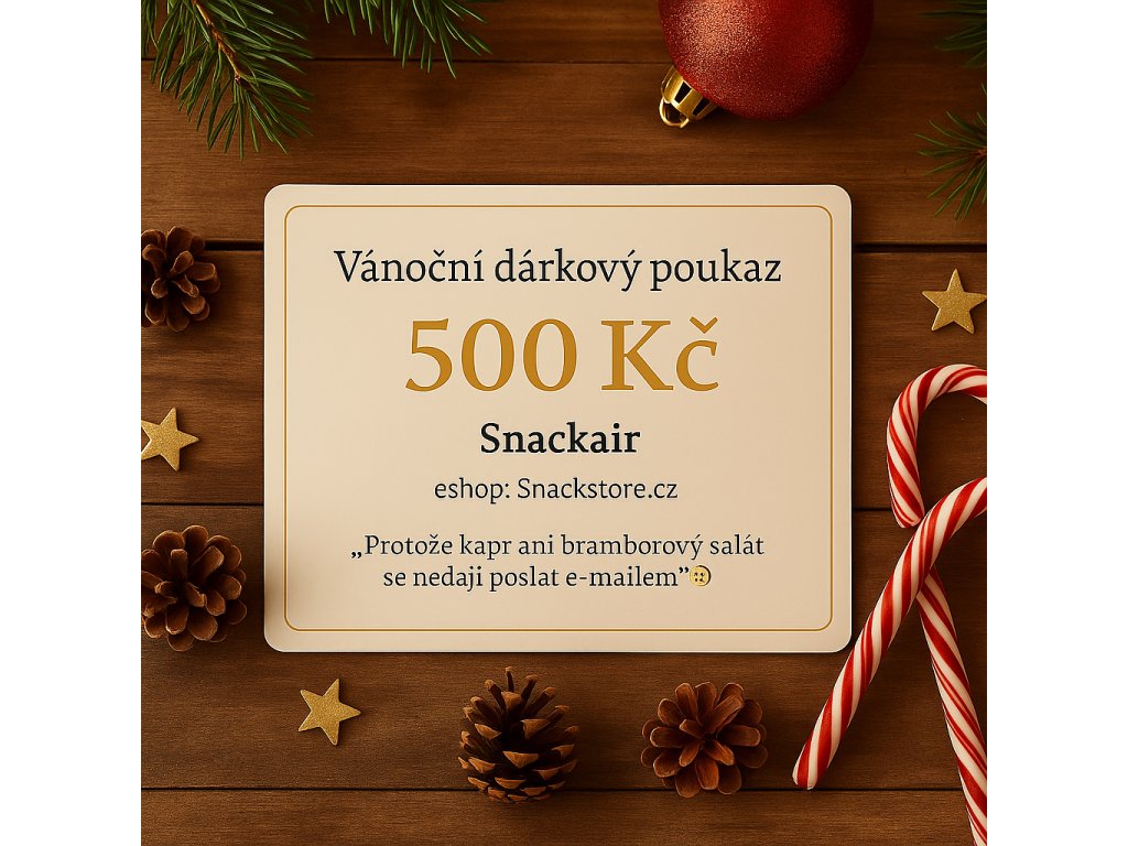 Digitální dárkový poukaz na SnackStore.cz. Pošleme ti ho e-mailem i s tajemným kódem, kterej je víc sexy než PIN od kreditky. Ten kód si můžeš přepsat na voucher a dát ho pod stromeček – tvá role Santy je tím splněná. 🎁✨