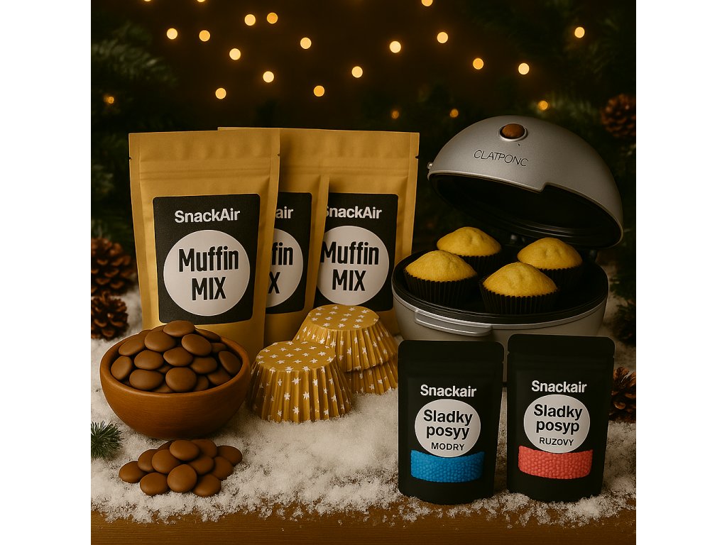 ⚙️ Výrobník muffinů – mašina, co zvládne 8 muffinů rychlejc než ty řekneš „hladovej“. Žádná trouba, žádnej stres, jen čerstvej muffinovej ráj. 🥣 3X - Muffin mix 500 g – sypká směs, co udělá muffiny nadýchaný jak Santa po štědrovečerní večeři. ⭐ Košíčky na muffiny (zlaté s hvězdičkami, 40 ks) – protože i tvoje těsto si zaslouží outfit sezóny. 🔴 Cukrářský posyp – červený máček 100 g – když chceš, aby tvůj muffin vypadal jak z Pinterestu (a chutnal ještě líp). 🔵 Sladký modrý posyp 100 g – vánoční sníh v barevný formě. Hodíš to na muffiny a máš vizuální porno. 🍫 Mléčná čokoláda v peckách 300 g – poleva, co se roztéká pomalejc než tvoje sebeovládání.
